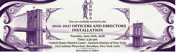 « All Events 2026-2027 Officers and Directors Installation (Brooklyn Chapter) June 16 @ 5:30 pm - 6:30 pm « CLE- Evidence Series The Martha E. Gifford Summer Program: What It’s “REALLY” Like to Practice Law as a Woman (New York Chapter) » RSVP Add to calendar Google Calendar iCalendar Outlook 365 Outlook Live Details Date: June 16 Time: 5:30 pm - 6:30 pm Organizer Brooklyn Women’s Bar Association View Organizer Website