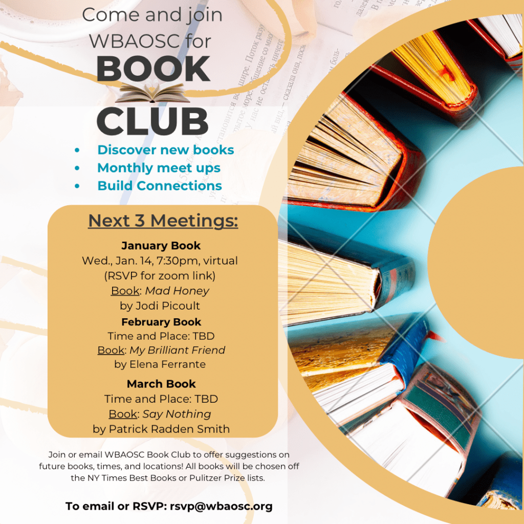 « All Events Book Club (Orange and Sullivan Chapter) January 14, 2026 @ 7:30 pm - 8:30 pm « WBASNY Ladies Who Lunch Hour Board of Directors Meeting » Add to calendar Google Calendar iCalendar Outlook 365 Outlook Live Details Date: January 14, 2026 Time: 7:30 pm - 8:30 pm Organizer Women’s Bar Association of Orange and Sullivan Counties View Organizer Website