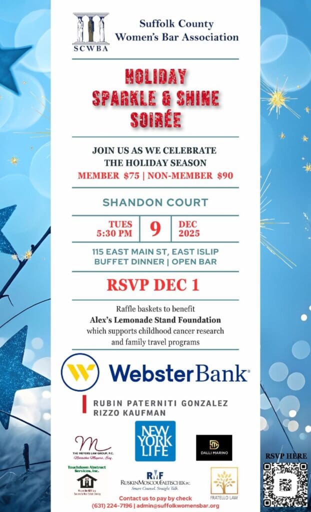 « All Events Holiday Sparkle & Shine Soiree (Suffolk Chapter) December 9 @ 5:30 pm - 6:30 pm « 2025 Holiday Party and Mittens Drive Fundraiser (Nassau Chapter) Holiday Meet and Greet with Wine Tasting (New York Chapter) » RSVP Now! Sponsor Directions Add to calendar Google Calendar iCalendar Outlook 365 Outlook Live Details Date: December 9 Time: 5:30 pm - 6:30 pm Organizer Suffolk County Women’s Bar Association Phone 631-849-5790 View Organizer Website