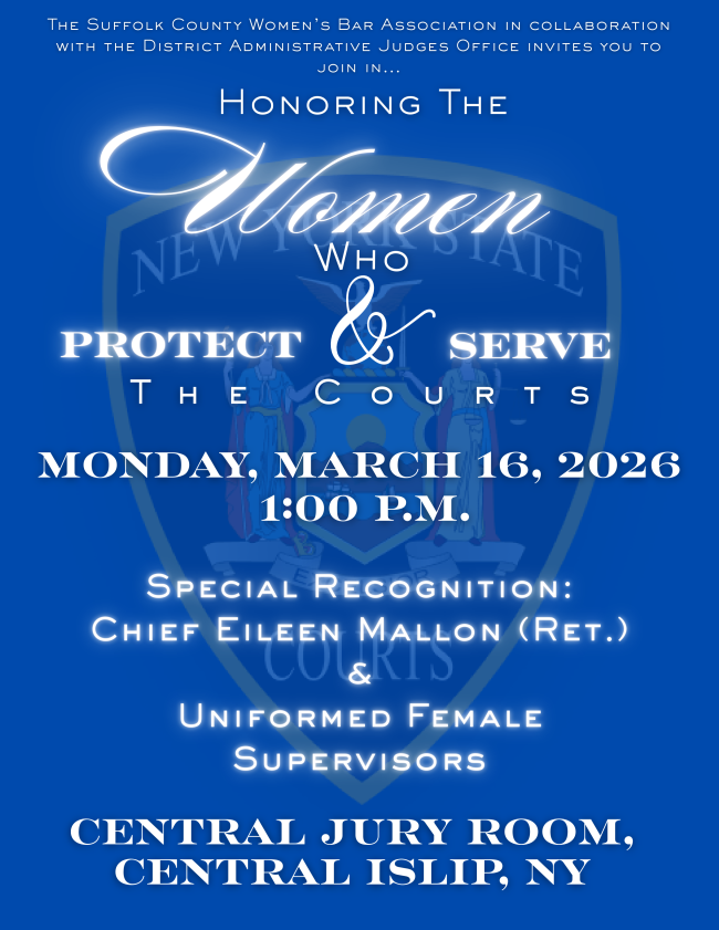 « All Events Honoring the Women Who Protect and Serve the Courts (Suffolk Chapter) March 16 @ 1:00 pm - 2:00 pm « Spring Family Fun Day (Western New York Chapter) The Judge Lisa M. Smith Book Club (Westchester Chapter) » Add to calendar Google Calendar iCalendar Outlook 365 Outlook Live Details Date: March 16 Time: 1:00 pm - 2:00 pm Organizer Suffolk County Women’s Bar Association Phone 631-849-5790 View Organizer Website
