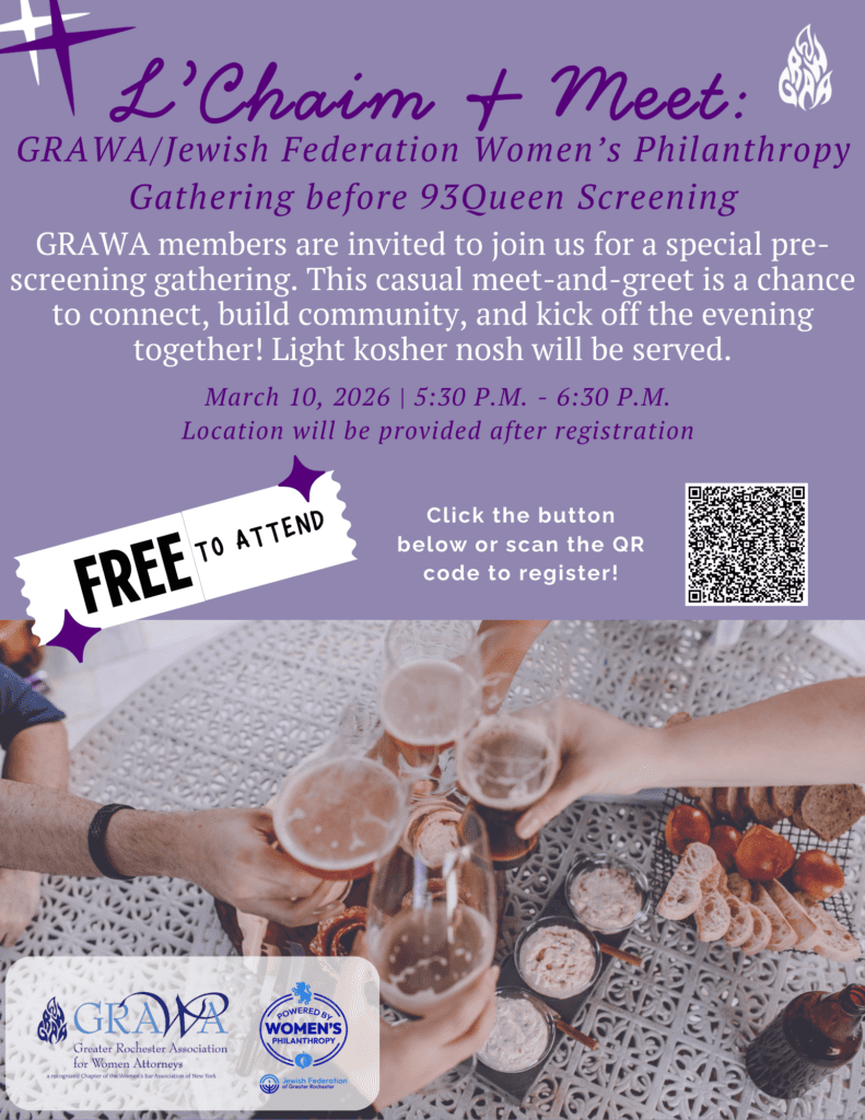 « All Events L’Chaim + Meet: GRAWA/Jewish Federation Women’s Philanthropy Gathering before 93Queen Screening (GRAWA) March 10 @ 5:30 pm - 6:30 pm « NYWBA Cycle for Survival 2026 Officers Zoom Meeting (WBASNY) » REGISTER HERE Add to calendar Google Calendar iCalendar Outlook 365 Outlook Live Details Date: March 10 Time: 5:30 pm - 6:30 pm Organizer Greater Rochester Association for Women Attorneys Phone 585-615-0134 View Organizer Website